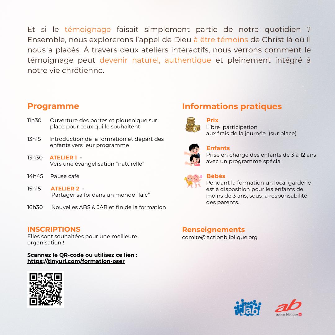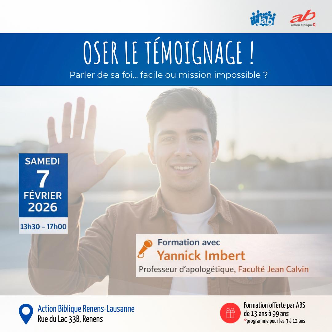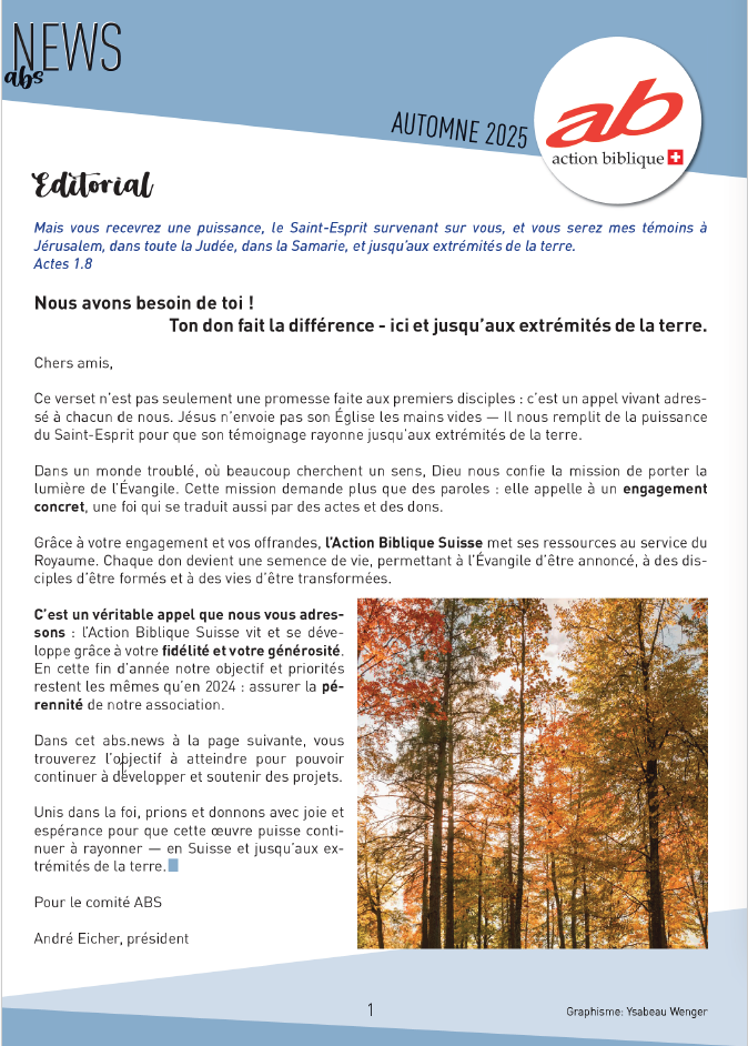Die Action Biblique Schweiz ist eine Vereinigung von Gemeinden, der es am Herzen liegt, das Evangeliums in der Schweiz und weltweit zu fördern.